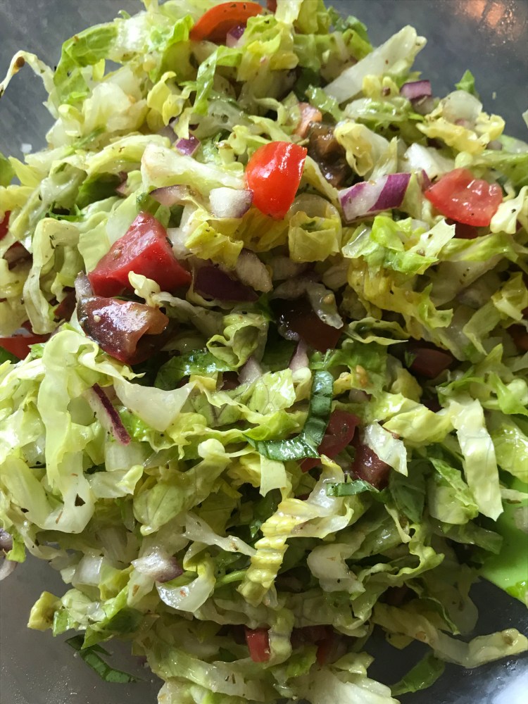 3. Place all remaining salad topping ingredients in a large mixing bowl, top with olive oil mixture and toss until well combined.