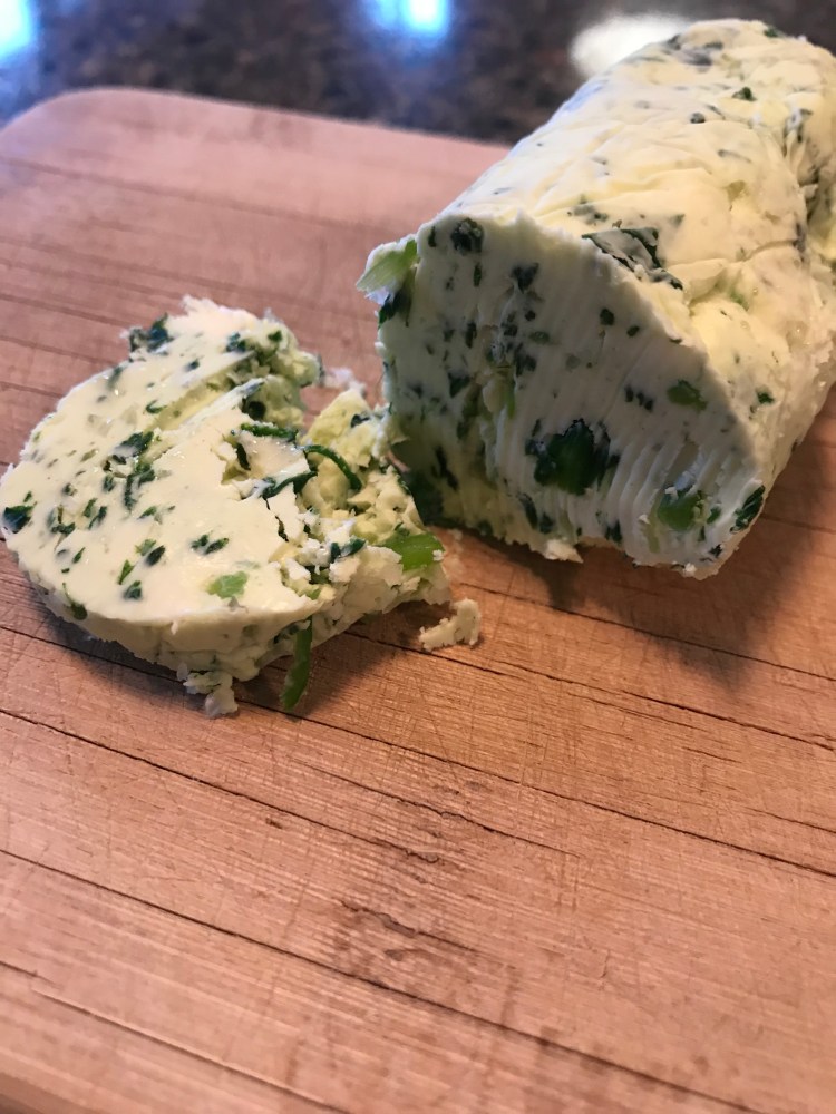 2. In a food processor, pulse the ramps, butter, and salt until well combined, about 30 seconds. Divide the butter in half and place each blob on a sheet of plastic wrap. Wrap the butter in the plastic wrap, gently rolling and shaping the butter into a log, and twist the ends of the plastic. Place in a resealable plastic bag and freeze. Slice off rounds of butter as needed.