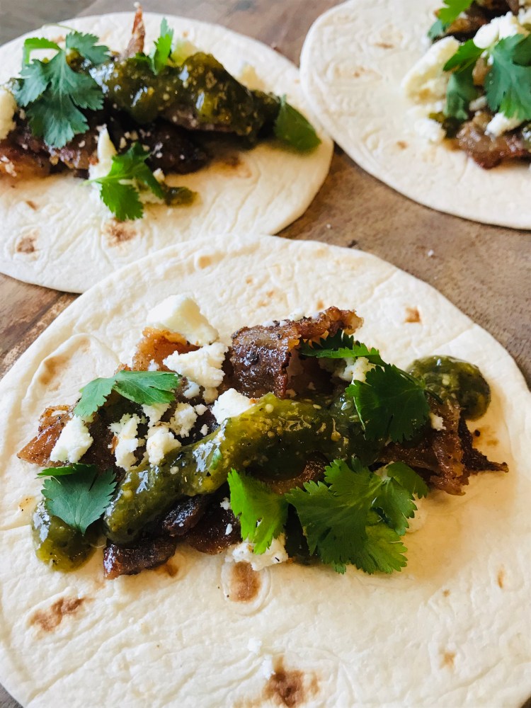 2. On a tortilla, place pieces of pork, Queso Fresco, salsa, and cilantro.