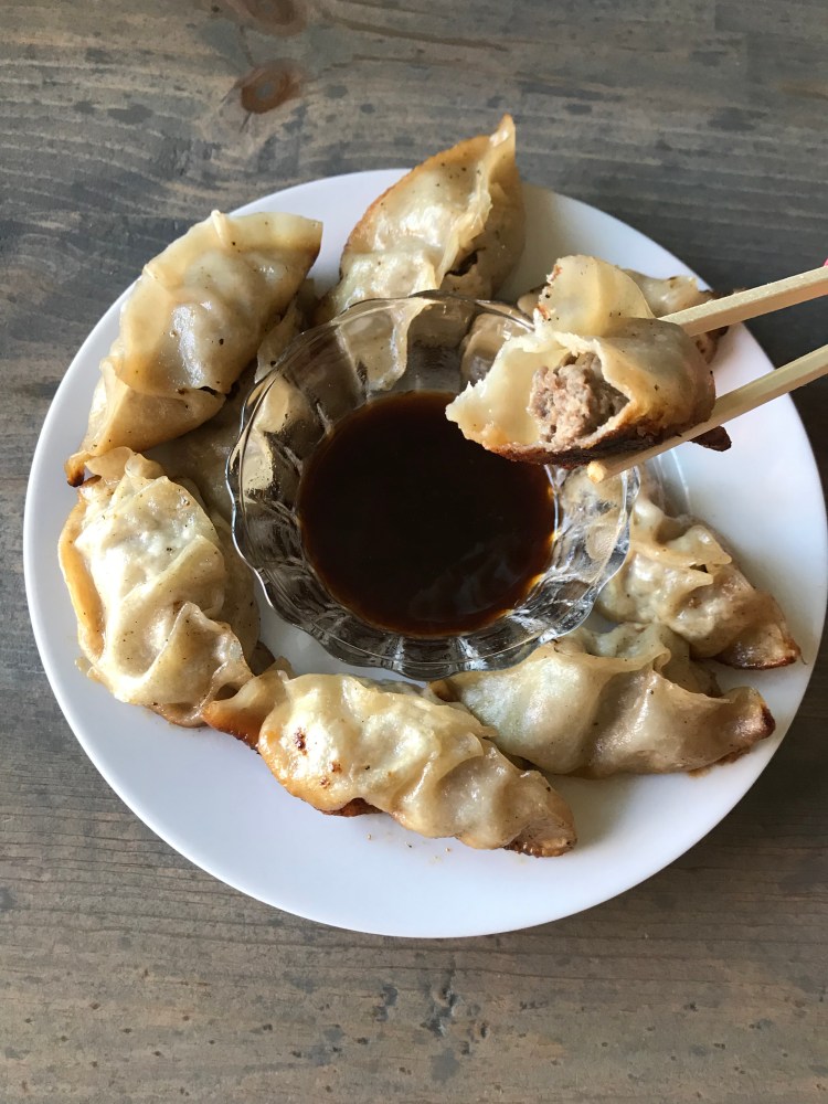 5. Heat the veggie oil over high heat in the same skillet. Working in batches, pan-fry the dumplings by placing them bottom-side down and frying until golden brown, 1 to 2 minutes.