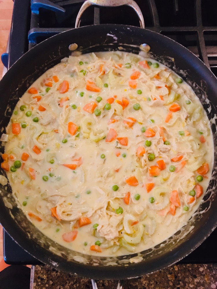 3. Pour in the chicken broth, stirring constantly. Stir in the bouillon cube and combine. The flour will combine with the chicken to create a gravy. Next, add the peas.