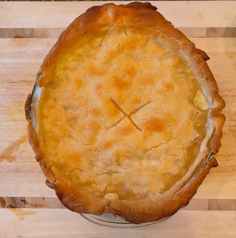 6. Roll out the pastry so that it’s 1 inch larger than the pan. Place the crust on top of the chicken mixture and cut small slits in the top. Press the crust gently into the sides of the dish to seal.