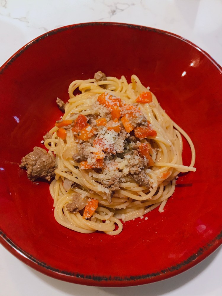When the sauce looks like it may be drying out, add a few ladles of the beef stock to moisten it, keeping the bolognese at a low bubble.