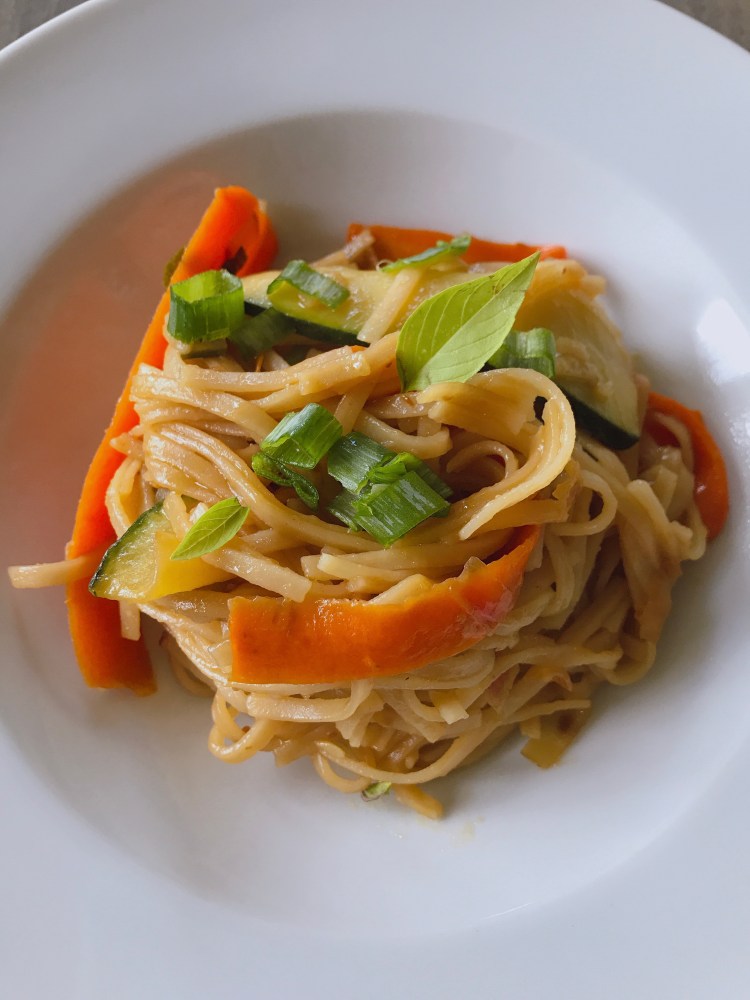 4. Stir in the noodles and basil. Toss to combine, cooking another 3-5 minutes until the sauce coats the noodles. Serve the noodles warm, topped with additional basil. Enjoy!
