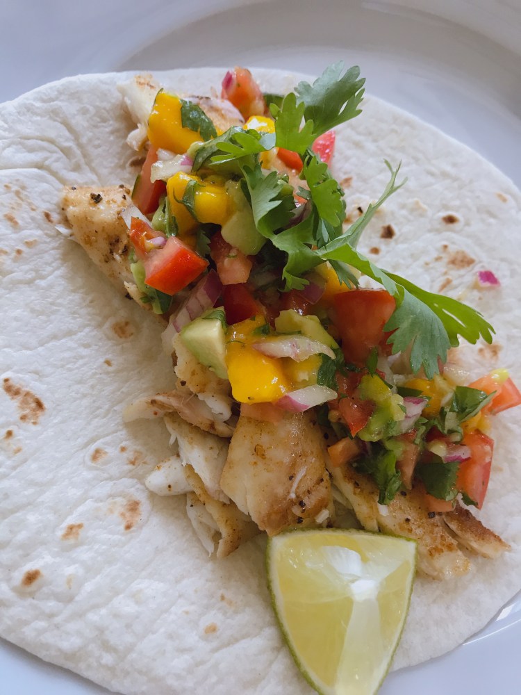 4. Remove filets from pan and crumble. Serve on flour tortillas and top with avocado-mango salsa, cilantro leaves and lime wedge.