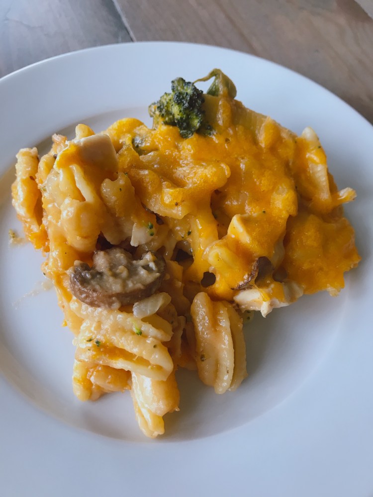 4. Sprinkle the flour evenly over the onion mixture and stir until combined. Cook for 1 minute, stirring occasionally. Add in the stock, and stir everything together until most of the clumps are gone. Add in the milk, mustard, salt and pepper and stir until combined. Continue cooking the sauce until it reaches a simmer. Remove from heat and stir in 1 cup of the shredded cheese until it is combined. Taste and season with additional salt and pepper, if needed. Add chicken, pasta and broccoli and stir to combine.