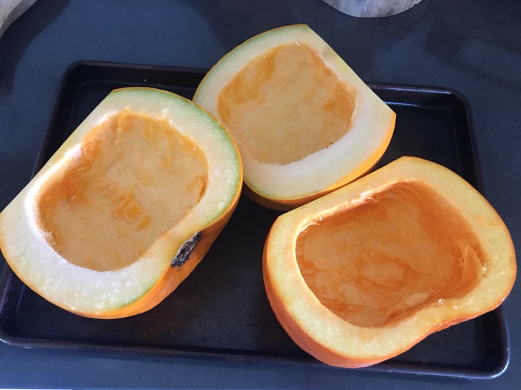 3. Place the pumpkin halves cut side down on the sheet pan. Roast at 400 degrees for 35 to 45 minutes, or until the pumpkins have partially collapsed and the flesh is very soft and beginning to pull away from the skin.