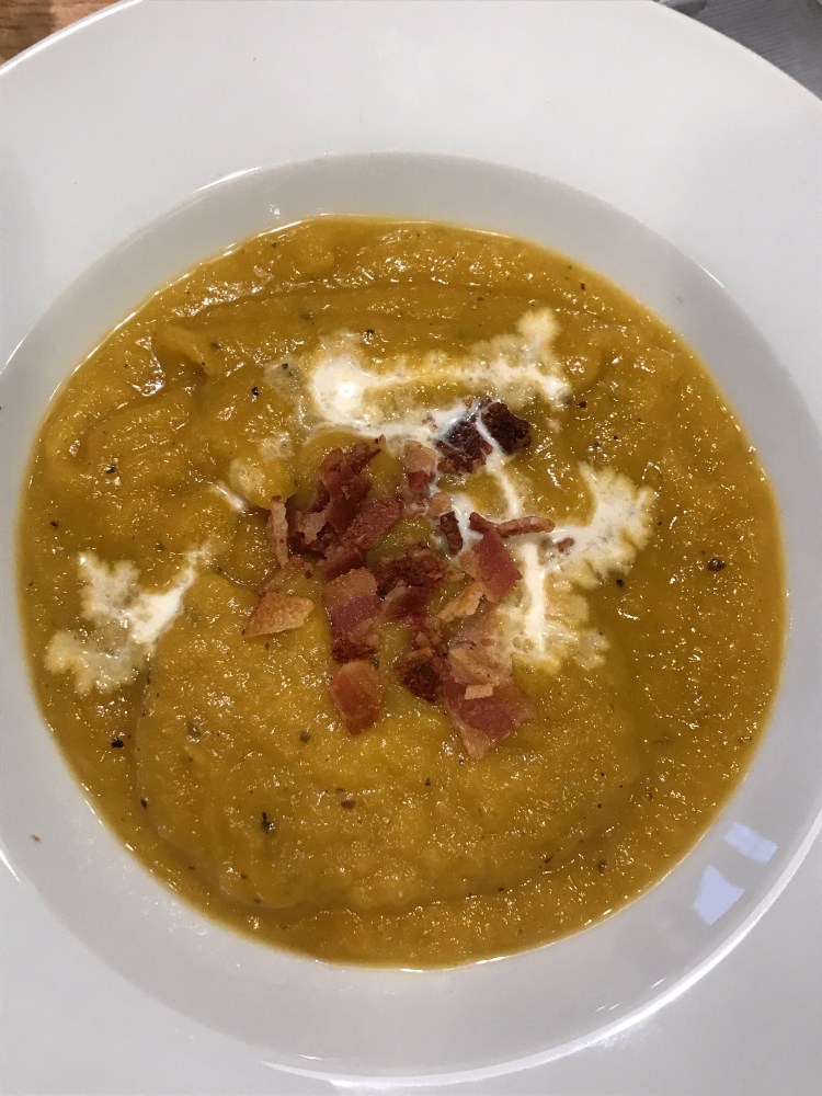 4. To serve, ladle the soup into bowls and garnish with a sprinkling of the bacon and a drizzle of cream!