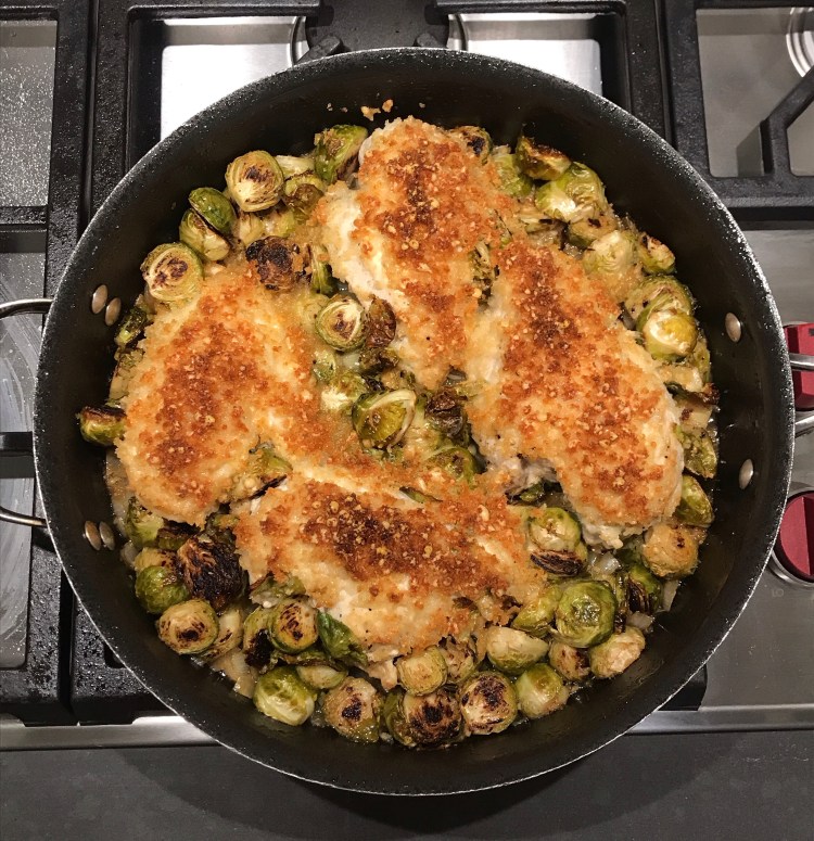 • Return chicken and brussels back to the sauce. Divide cheese and breadcrumb mixture evenly among chicken breasts. Bake 15 minutes.