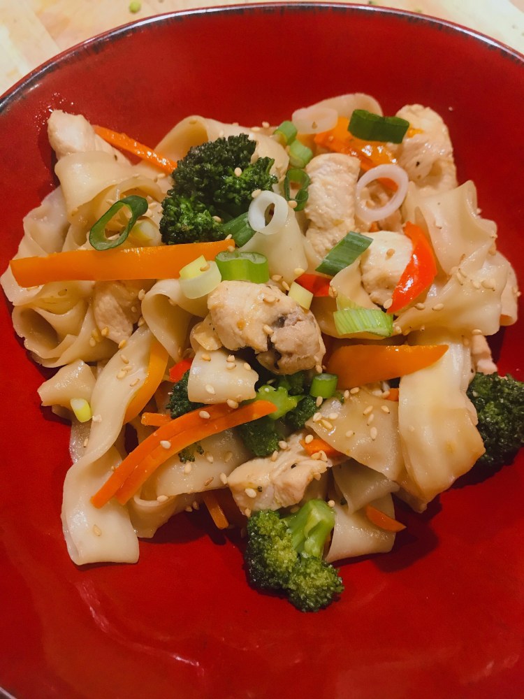 2. Season chicken with salt and pepper. Heat the 2 tablespoons of sesame oil in a large skillet over medium high heat. Add chicken and cook 6-7 minutes, or until done and no longer pink in the middle. Remove from skillet and place on a plate. Set aside.