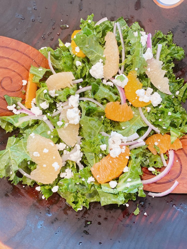 2. Whisk together orange juice and next 6 ingredients. Add oil in a slow steady stream, whisking constantly until smooth. Toss together kale, onion, and 1/2 cup dressing in a large bowl. Add salt and pepper to taste. Top salad with citrus, and sprinkle with cheese. Serve with remaining dressing.