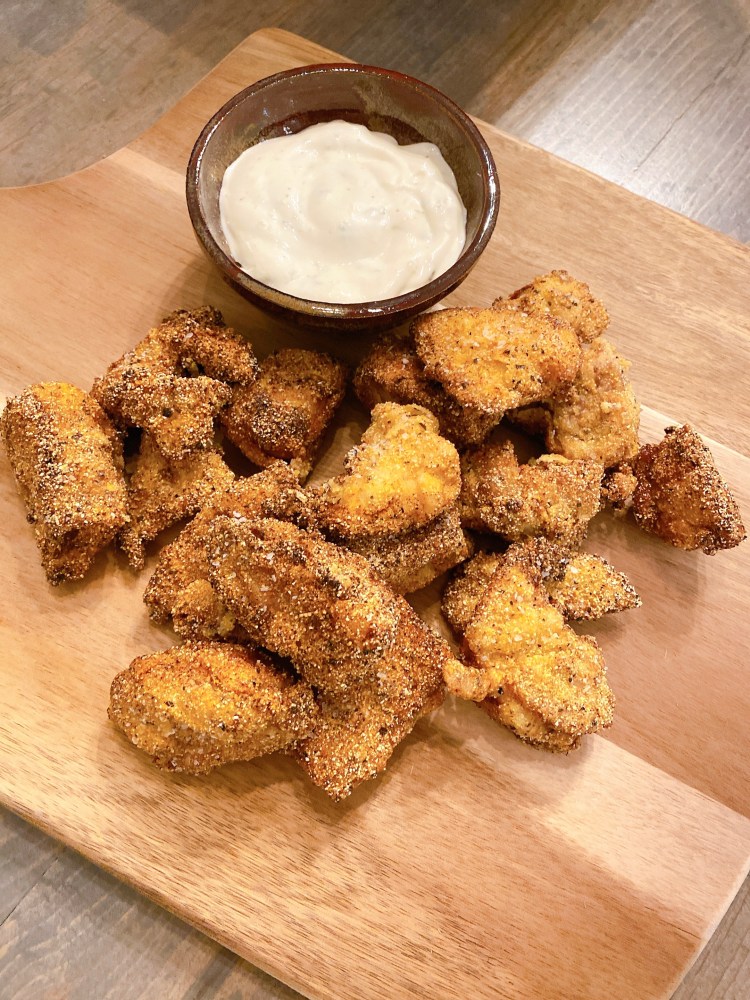 3. Add to a large resealable bag the flour, cornmeal, garlic powder, cayenne pepper, and black pepper. Squeeze off excess liquid from meat, and add one handful of meat to the resealable bag. Shake to coat. Remove meat, shake off excess flour, and set on a plate. Repeat with remaining meat.