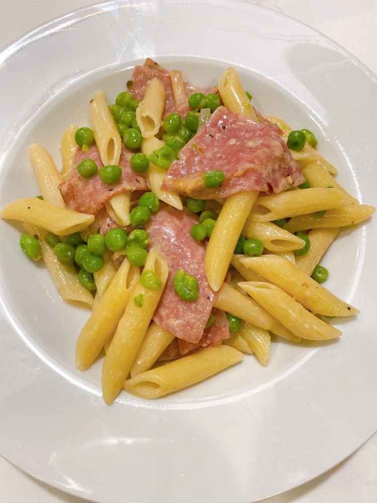 1. Bring a large pot of lightly salted water to a boil. Place pasta in the pot, and cook according to package directions. Mix in peas just before pasta finishes cooking. Drain, reserving 1 cup of pasta water.