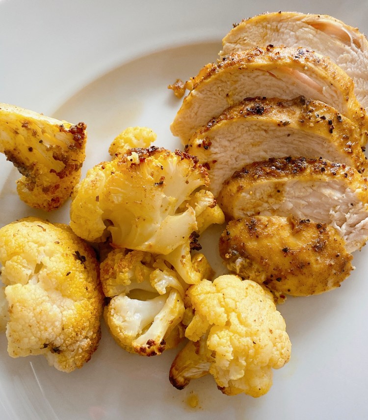 6. Thickly slice chicken across grain; fan over serving plates. Divide cauliflower among plates; squeeze 1/2 lime over top and serve with additional lime wedges.
