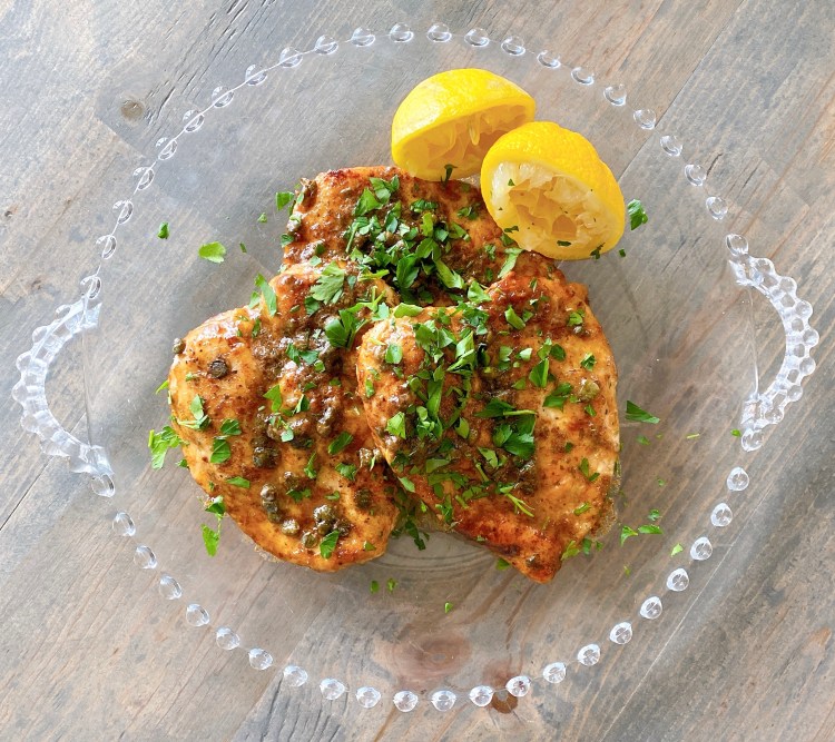 3. Into the pan add the lemon juice, stock and capers. Return to stove and bring to boil, scraping up brown bits from the pan for extra flavor. Check for seasoning. Return all the chicken to the pan and simmer for 5 minutes. Remove chicken to platter. Add remaining 2 tablespoons butter to sauce and whisk vigorously. Pour sauce over chicken and garnish with parsley.