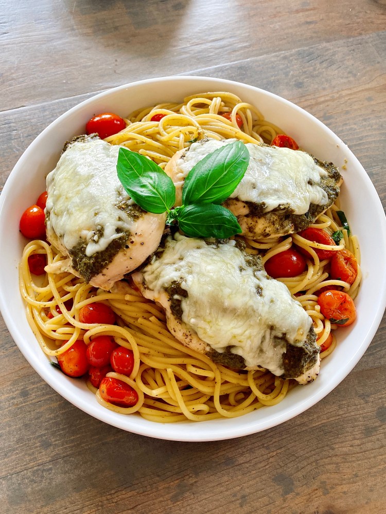 5. Five minutes before chicken is done, top each breast with a small handful of shredded cheese. Bake for 5 more minutes or until melted. Remove chicken from oven. Move chicken to a plate and remove garlic cloves from pan, discard. Pour tomatoes and their juices into the pasta along with fresh basil. Toss to combine.