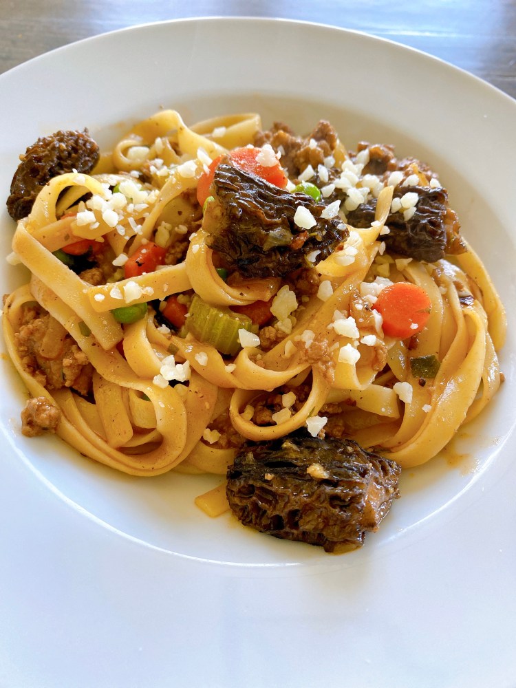 5. Saute morels, over medium heat, in butter for 5 minutes, stirring occasionally. Add peas and cook together another minute. Add to ragu and add reserved pasta water if needed