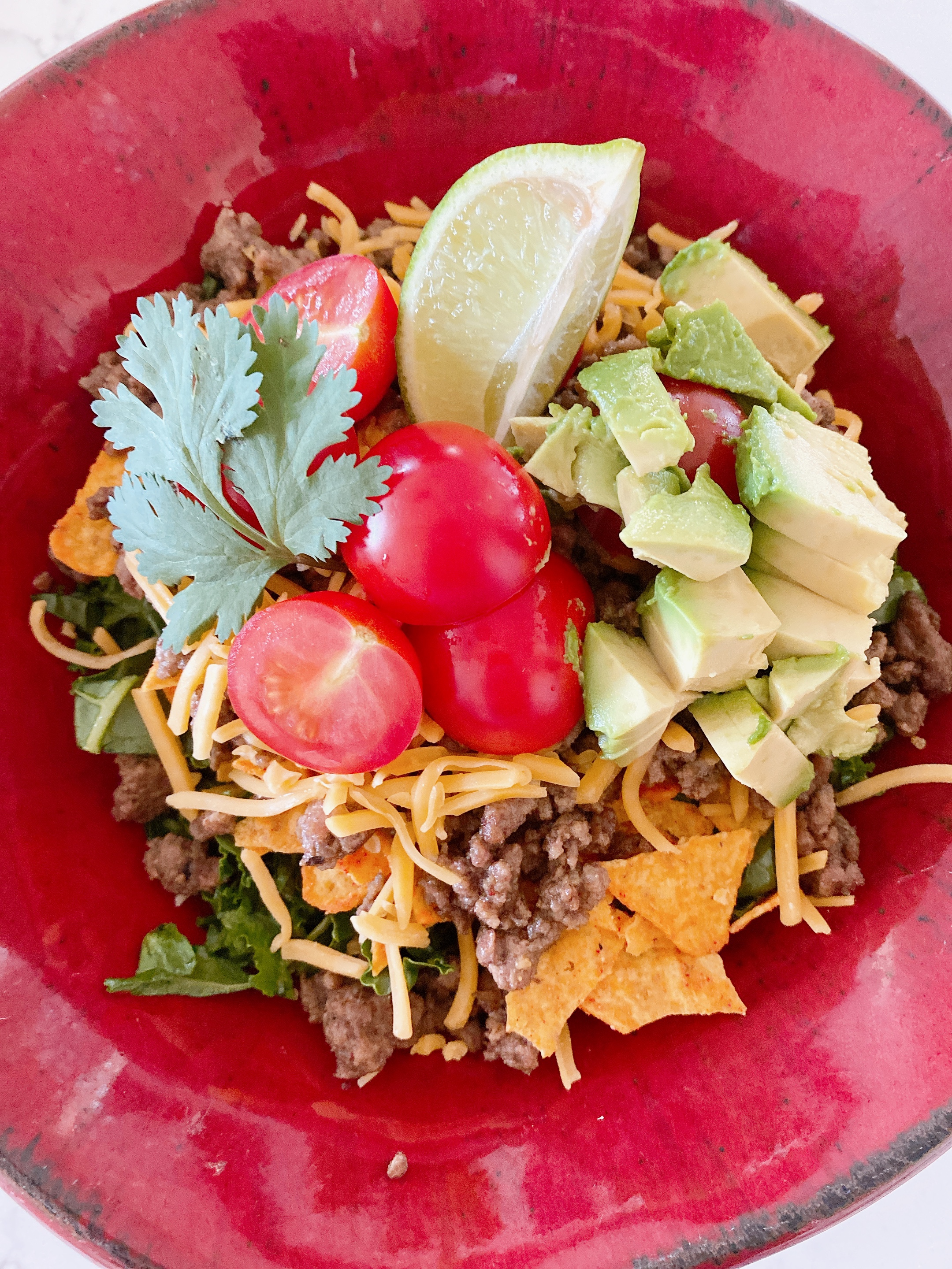 - To serve; divide kale mixture among four bowls. Layer with tortilla chips, ground beef, and cheddar cheese. Top with tomatoes, avocado, cilantro, and lime wedge.