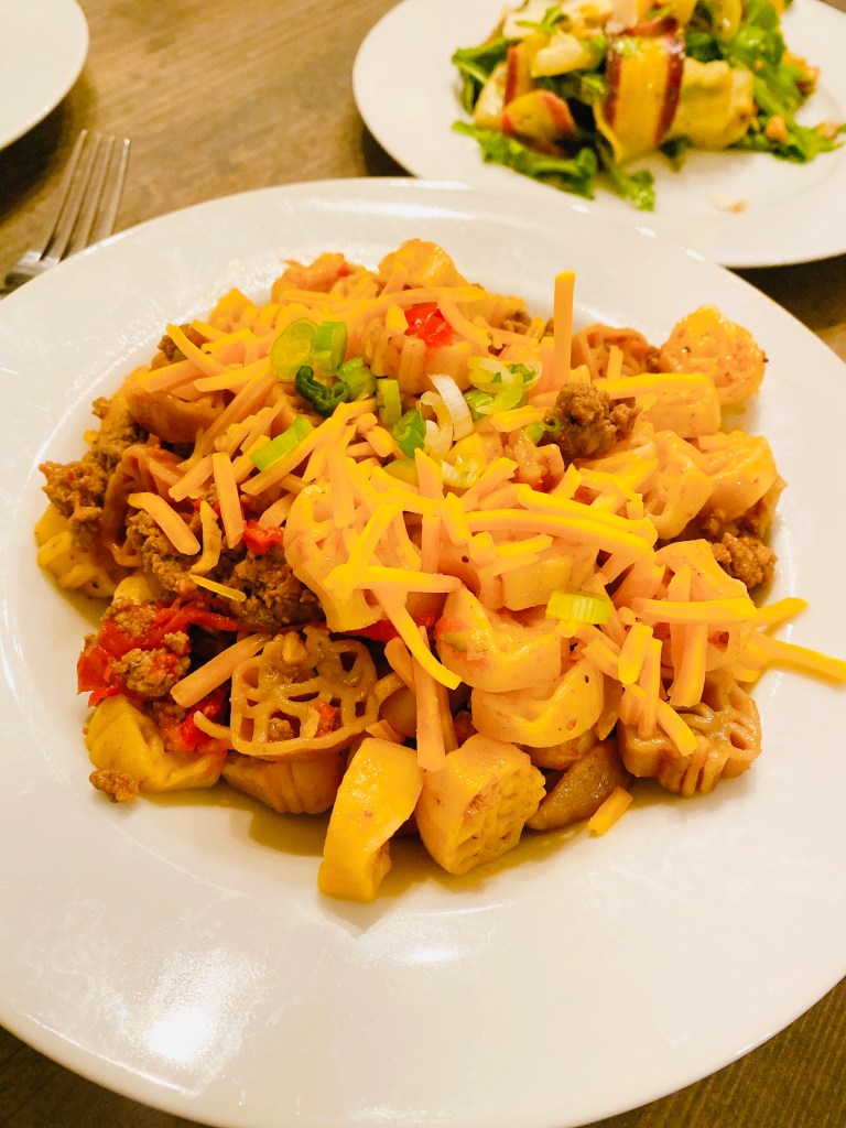 - Cook pasta according to package directions in salted boiling water. Meanwhile, in a large skillet, cook beef and onion over medium heat. Season with steak seasoning and seasoning salt. Cook until meat is no longer pink. Stir in the tomatoes, pickles, mustard, and ketchup.
