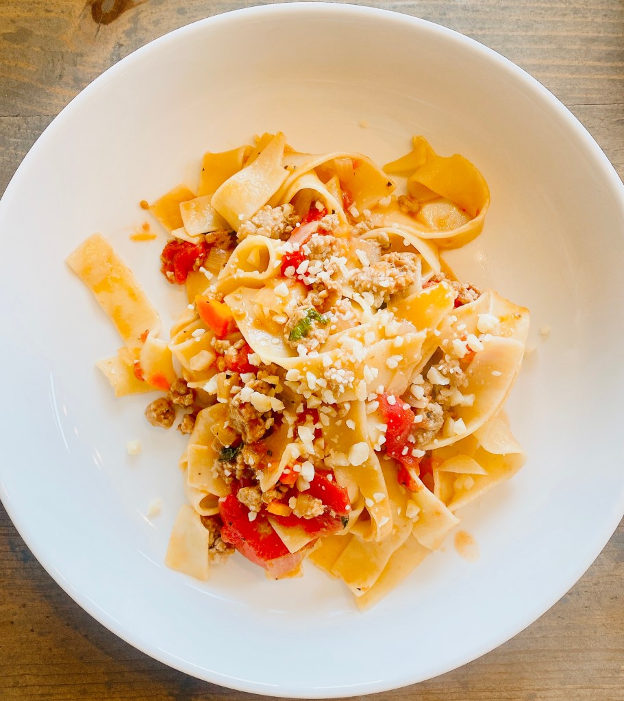 - Add torn basil and wilt the leaves into the hot sauce. Remove bay leaf from the sauce. Toss hot cooked pasta with 1/2 cup, grated cheese. Combine hot pasta and cheese with the veal ragu in a large serving bowl or platter. Serve with extra cheese for topping. Garnish platter with additional basil tops.