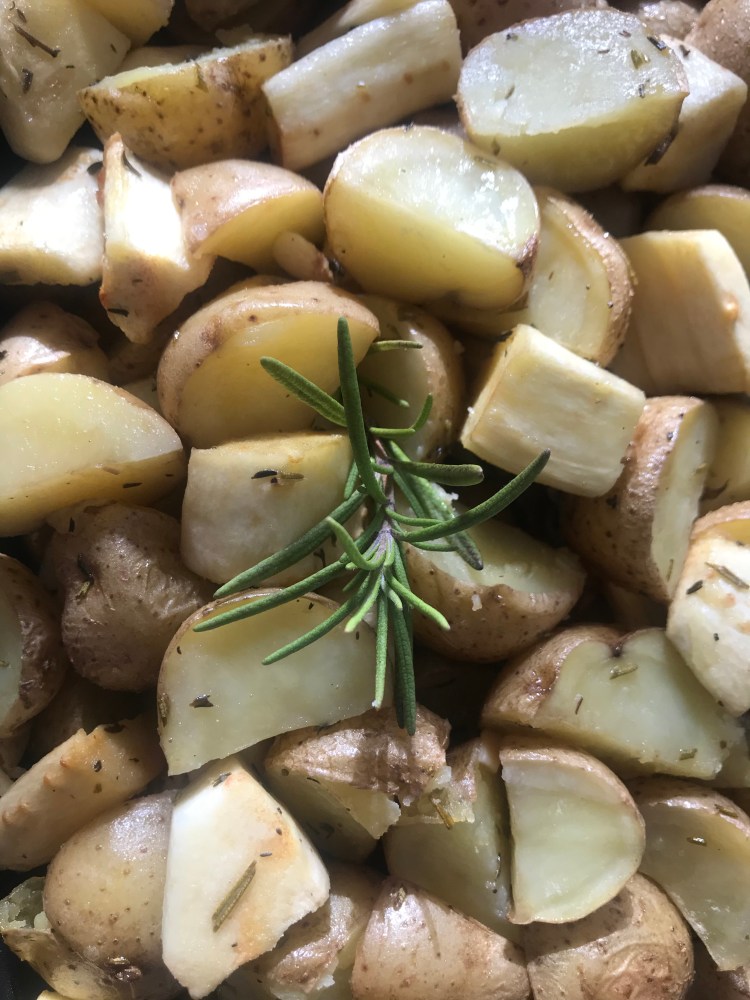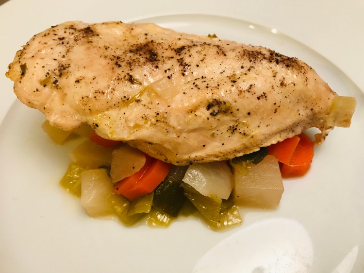 5. Add onion, carrot, celery and a pinch of salt and cook, stirring occasionally, until the vegetables have softened nicely, approximately 10 minutes. Add garlic, rosemary, thyme and bay leaf and cook for a minute or so, then return all the chicken to the pan, skin side up and between 1 and 3 cups stock, enough to come up the sides of the chicken but not to get them swimming. Bring to a simmer and then put the skillet in the oven.